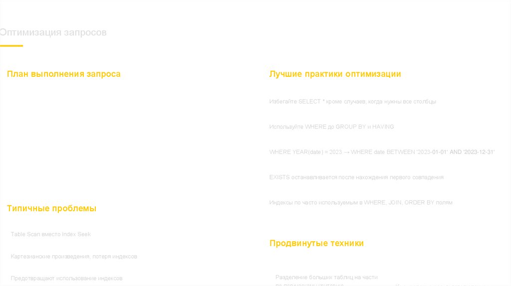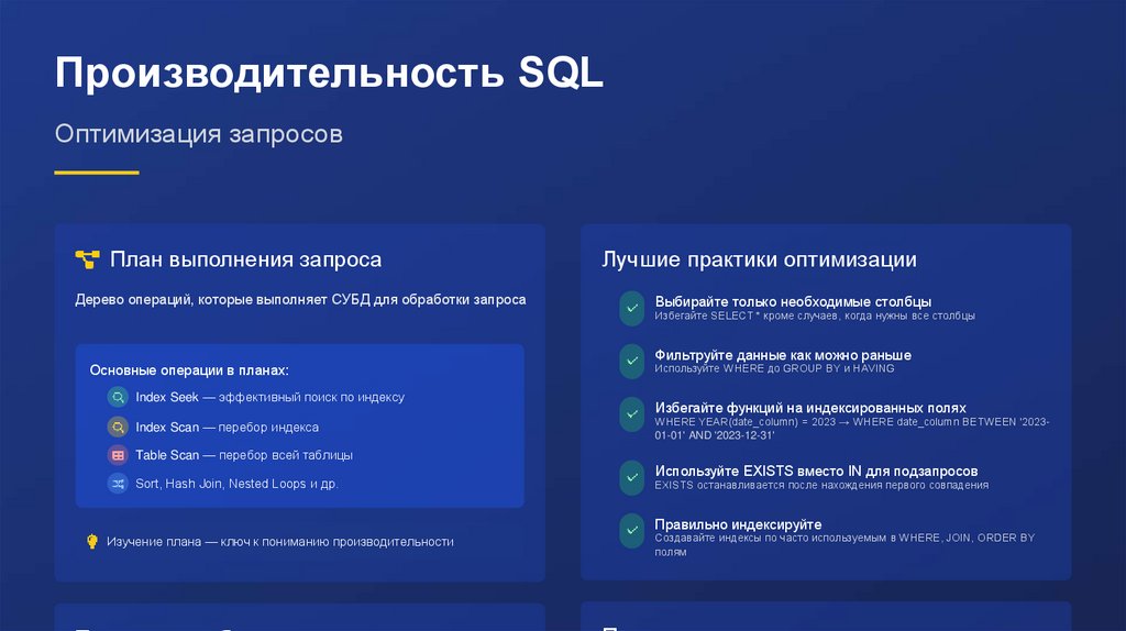 Индексы по часто используемым в WHERE, JOIN, ORDER BY полям