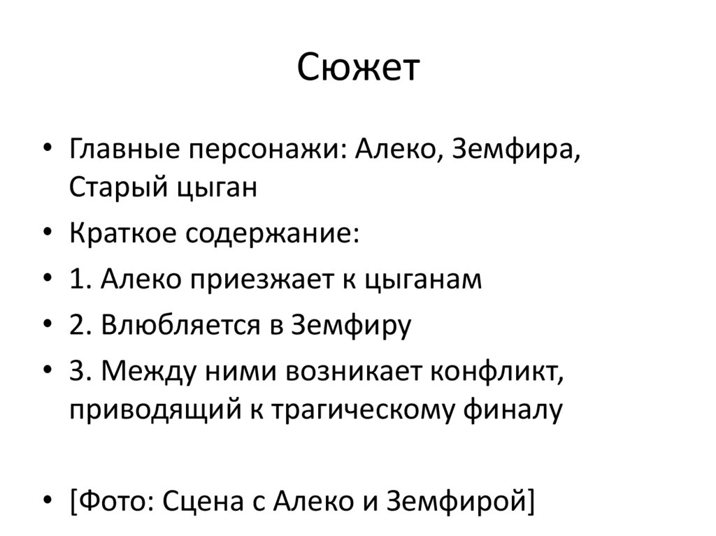 Сюжет• Главные персонажи: Алеко, Земфира,