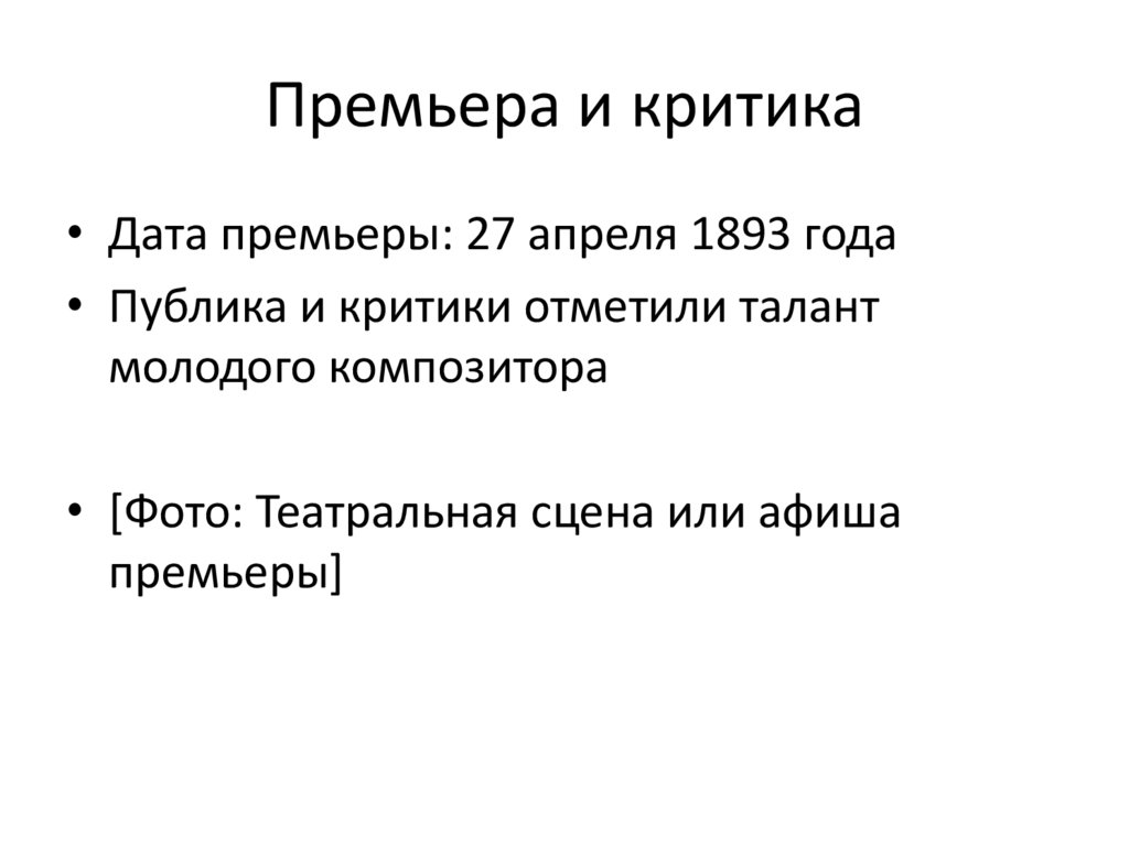 Премьера и критика• Дата премьеры: 27 апреля 1893 года