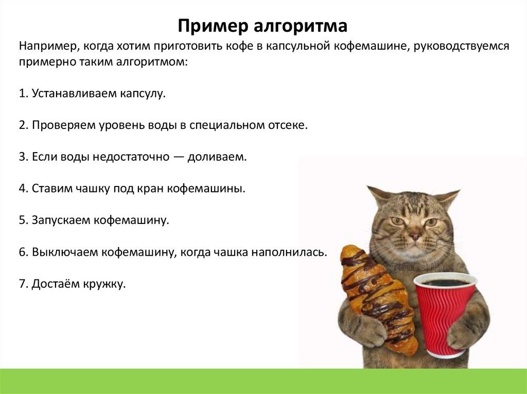 Пример алгоритмаНапример, когда хотим приготовить кофе в капсульной кофемашине, руководствуемся