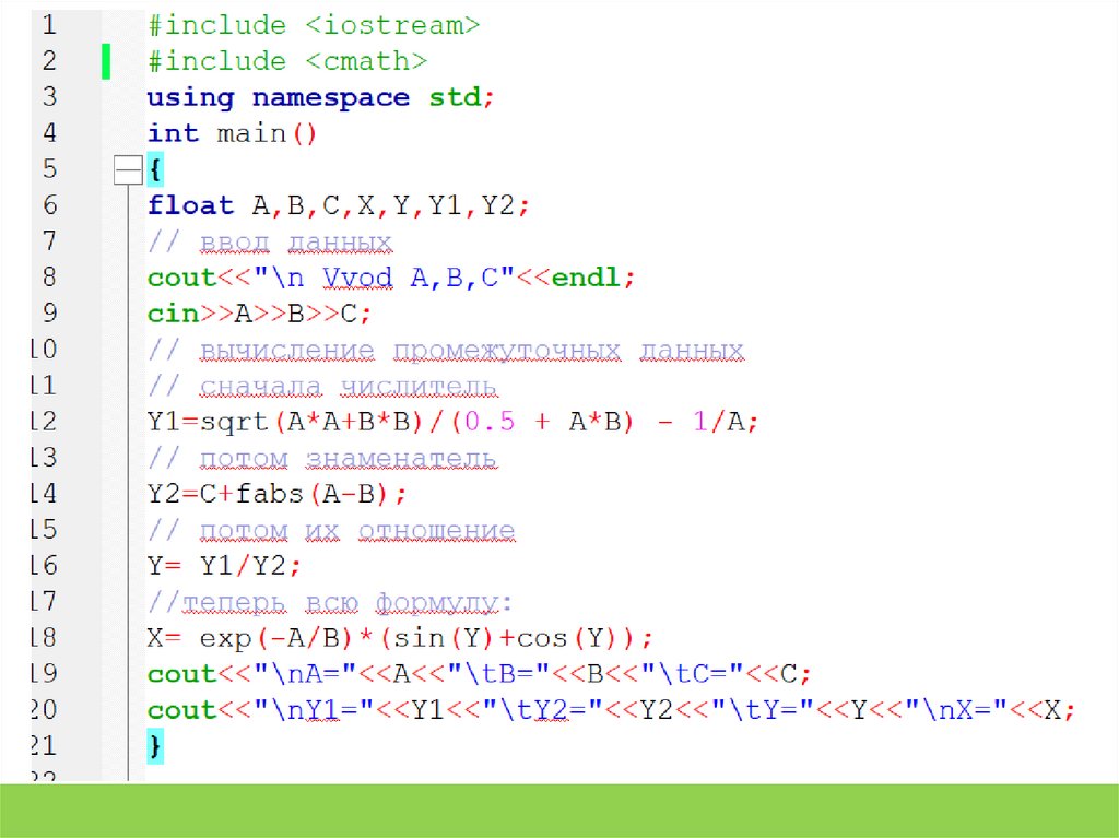 cin>>A>>B>>C;// вычисление промежуточных данных // сначала числитель