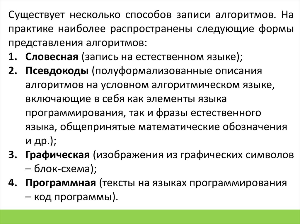 Существует несколько способов записи алгоритмов. Напрактике наиболее распространены следующие формы