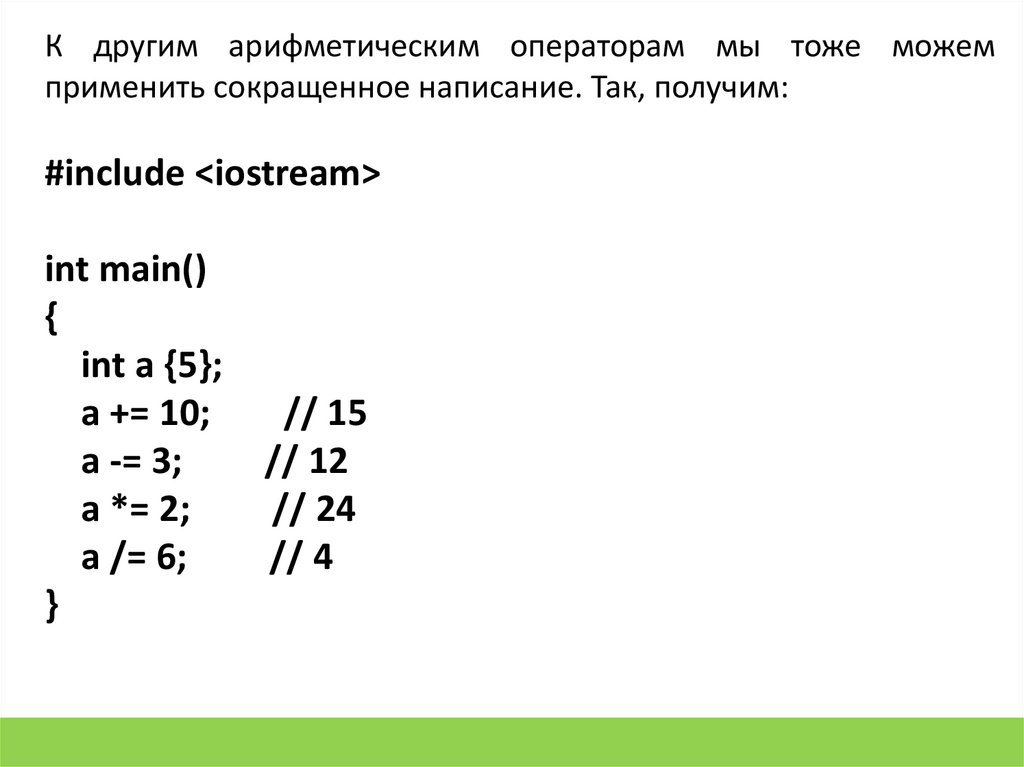 К другим арифметическим операторам мы тоже можемприменить сокращенное написание. Так, получим: