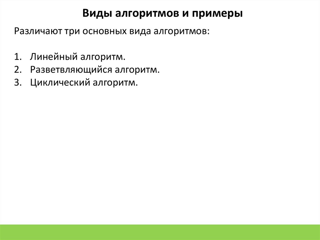 Виды алгоритмов и примерыРазличают три основных вида алгоритмов: