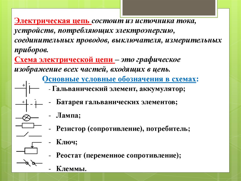 Электрическая цепь состоит из источника тока,устройств, потребляющих электроэнергию,