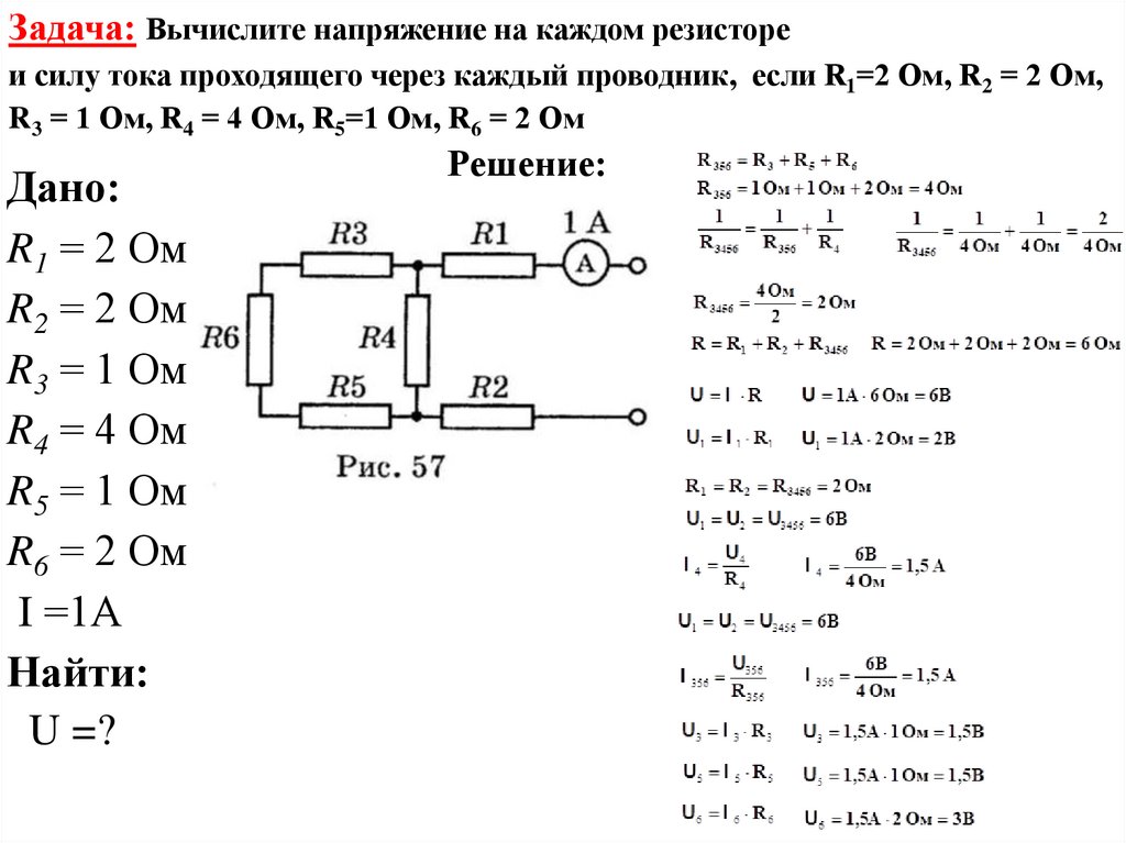 Задача: Вычислите напряжение на каждом резистореи силу тока проходящего через каждый проводник, если R1=2 Ом, R2 = 2 Ом,