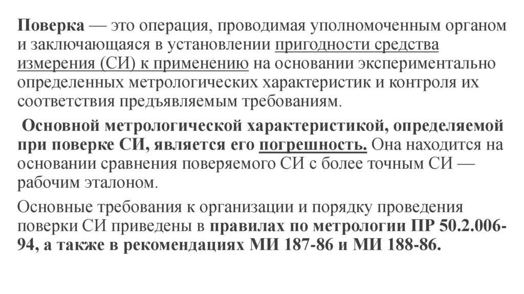 поверки СИ приведены в правилах по метрологии ПР 50.2.00694, а также в рекомендациях МИ 187-86 и МИ 188-86.