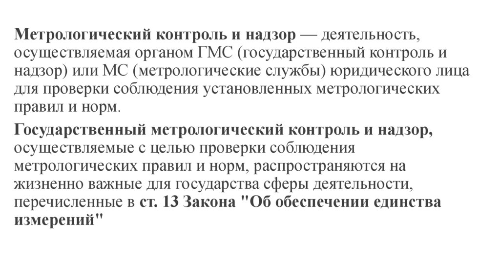 Метрологический контроль и надзор — деятельность,осуществляемая органом ГМС (государственный контроль и