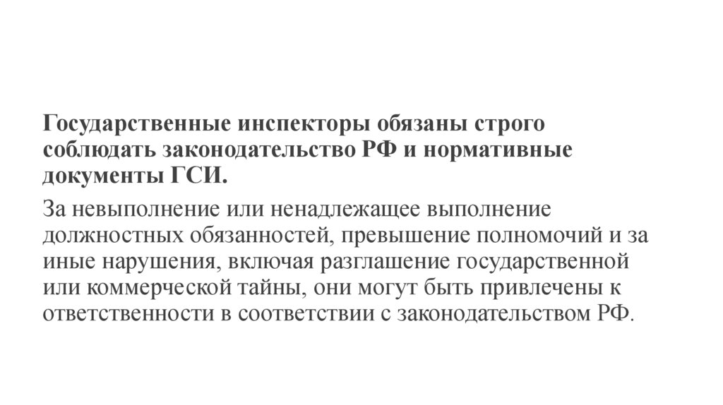 Государственные инспекторы обязаны строгособлюдать законодательство РФ и нормативные
