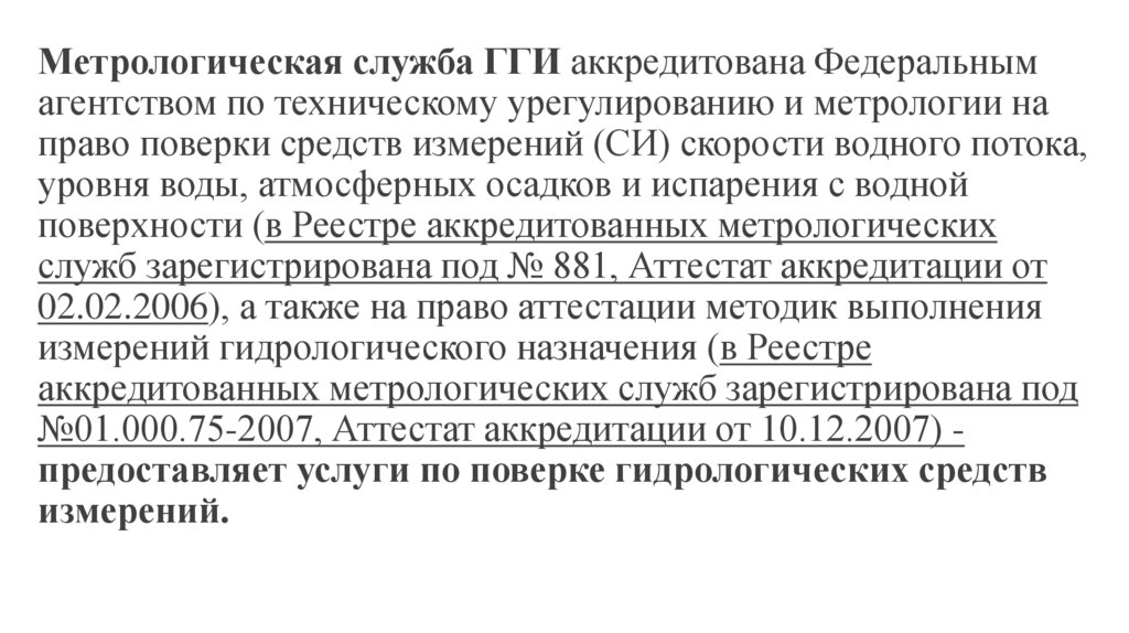 Метрологическая служба ГГИ аккредитована Федеральнымагентством по техническому урегулированию и метрологии на