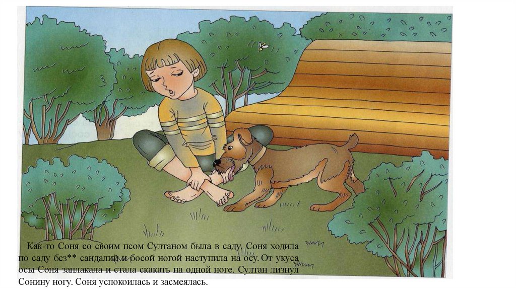 Как-то Соня со своим псом Султаном была в саду. Соня ходилапо саду без** сандалий и босой ногой наступила на осу. От укуса