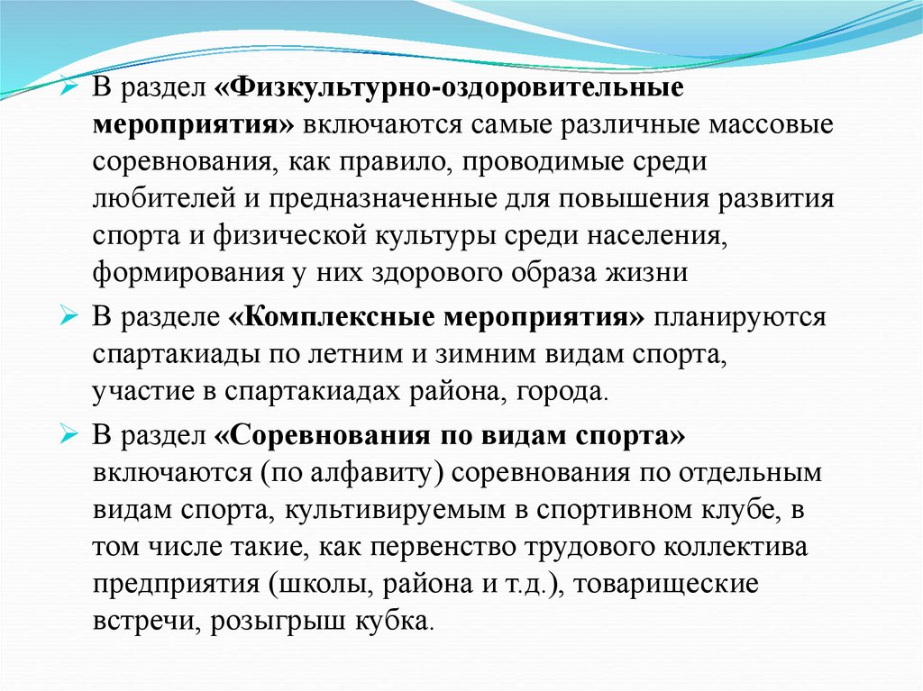 В раздел «Физкультурно-оздоровительныемероприятия» включаются самые различные массовые