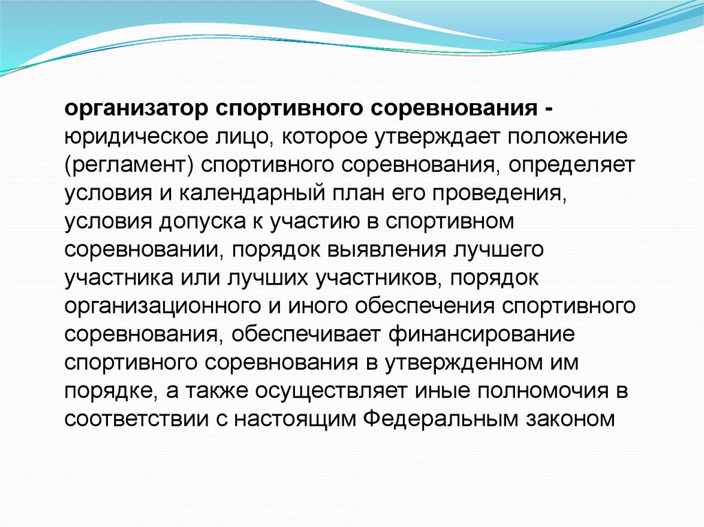 организатор спортивного соревнования юридическое лицо, которое утверждает положение(регламент) спортивного соревнования, определяет