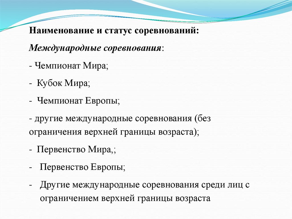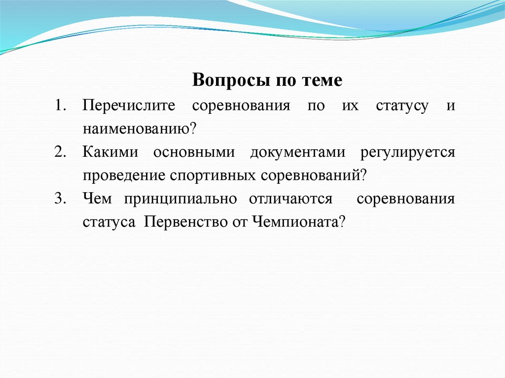 Вопросы по теме1. Перечислите соревнования по их статусу и