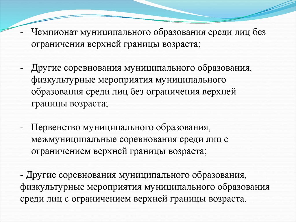 - Чемпионат муниципального образования среди лиц безограничения верхней границы возраста;