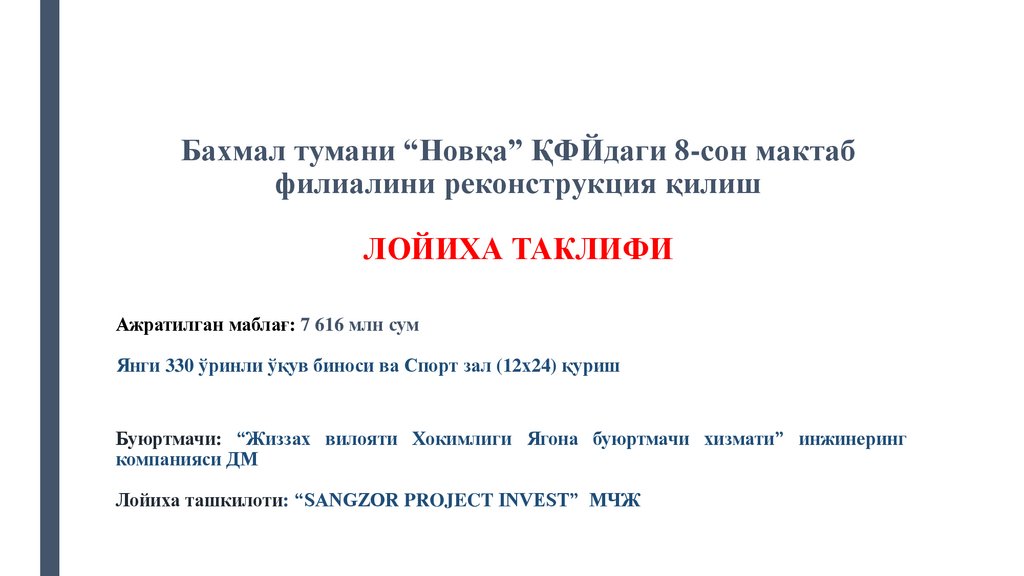 Лойиха ташкилоти: “SANGZOR PROJECT INVEST” МЧЖ