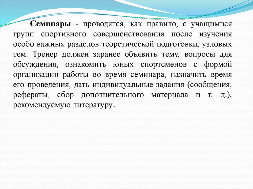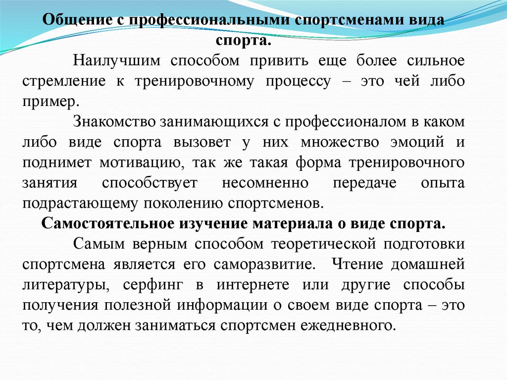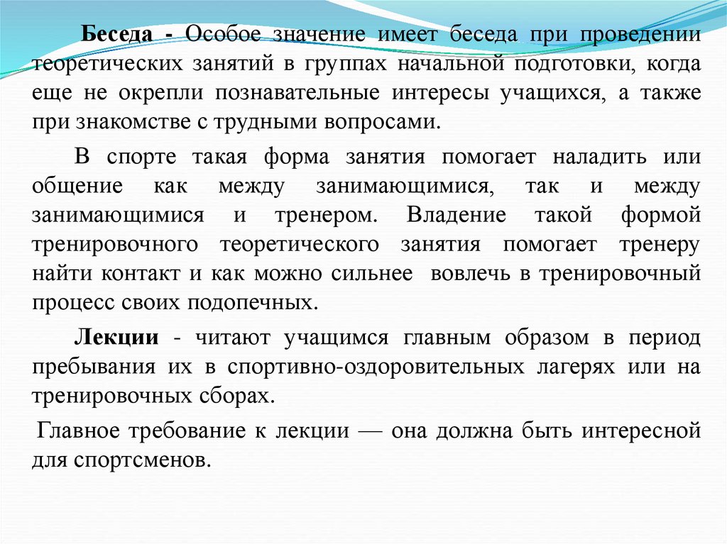 Беседа - Особое значение имеет беседа при проведениитеоретических занятий в группах начальной подготовки, когда
