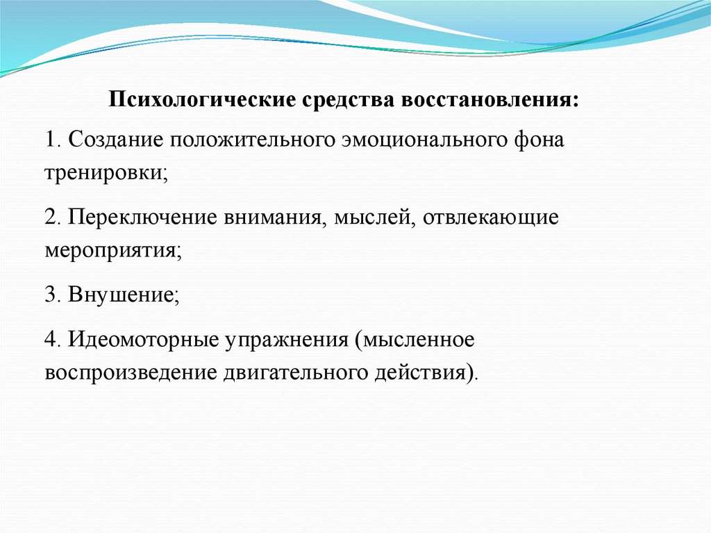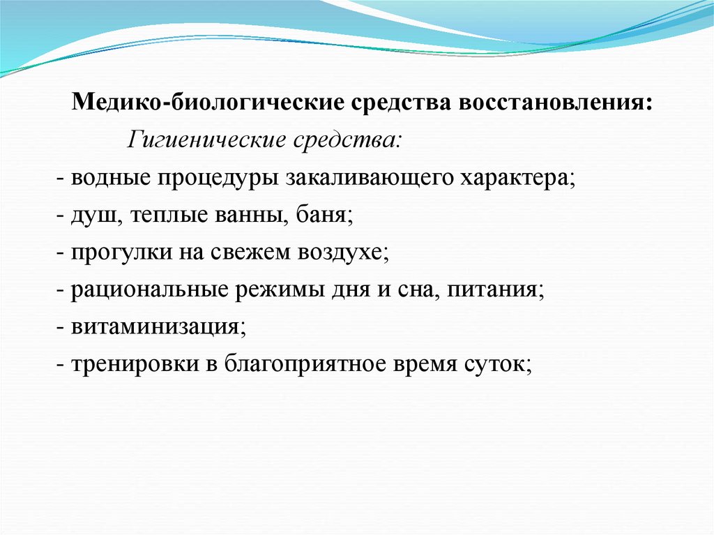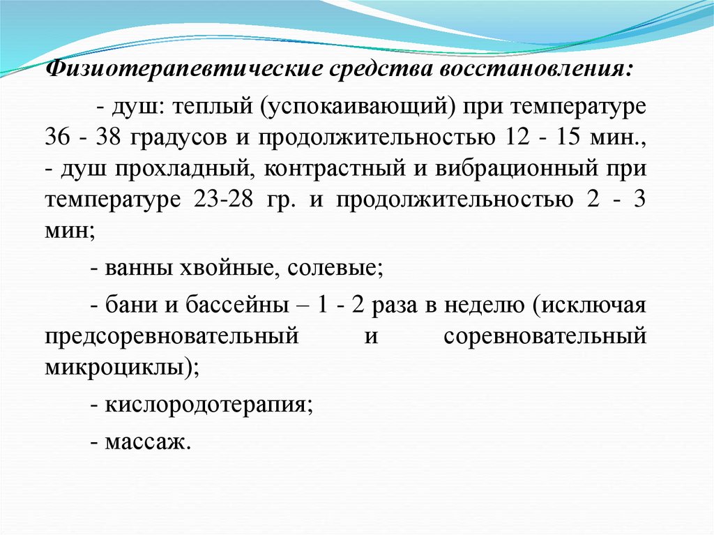 Физиотерапевтические средства восстановления:- душ: теплый (успокаивающий) при температуре