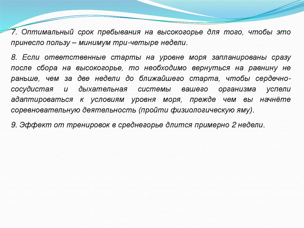 7. Оптимальный срок пребывания на высокогорье для того, чтобы этопринесло пользу – минимум три-четыре недели.