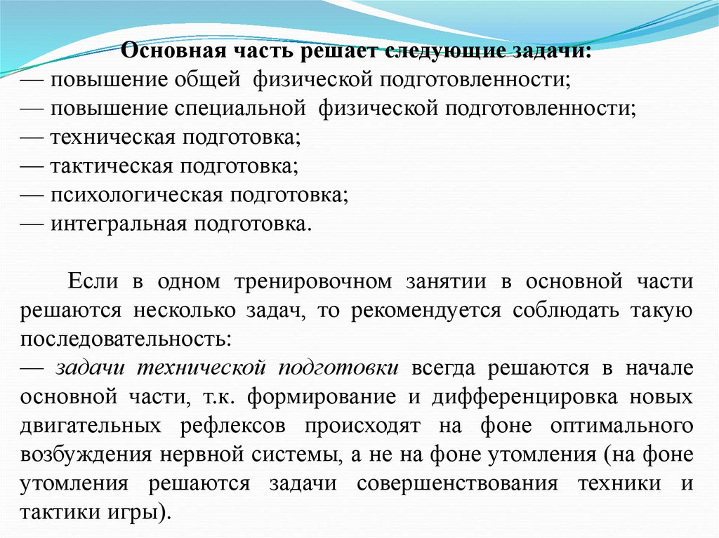 Основная часть решает следующие задачи:— повышение общей физической подготовленности;