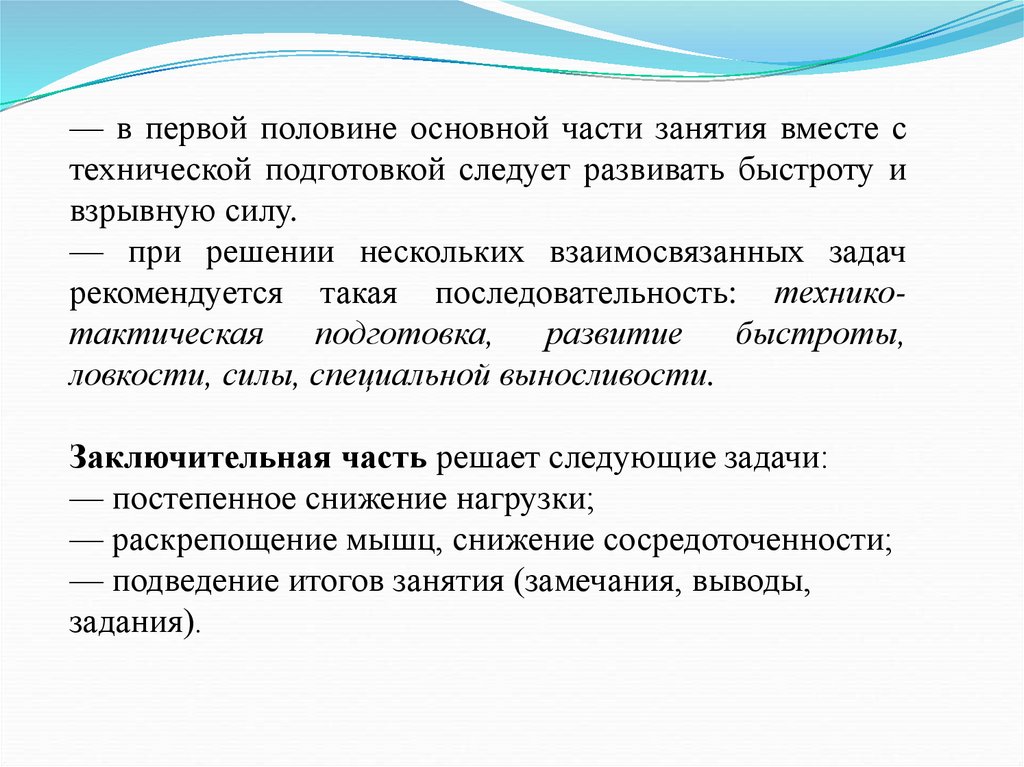 — в первой половине основной части занятия вместе стехнической подготовкой следует развивать быстроту и