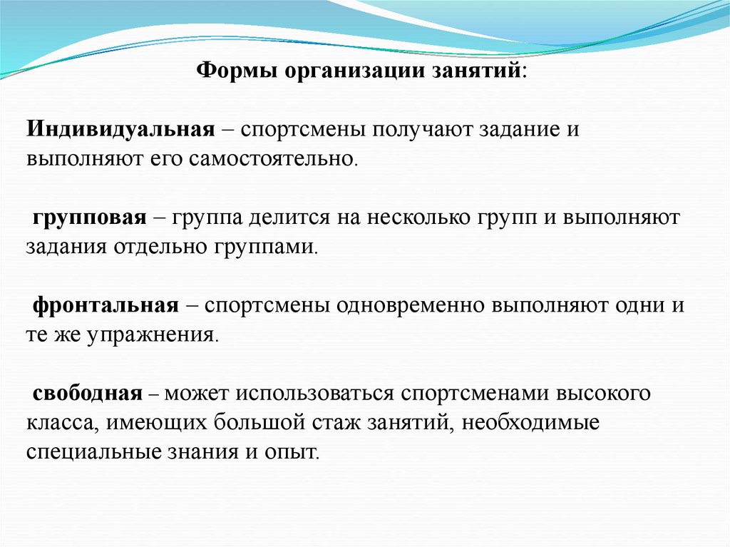 Формы организации занятий:Индивидуальная – спортсмены получают задание и
