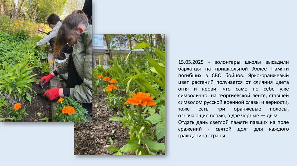 15.05.2025 - волонтеры школы высадилибархатцы на пришкольной Аллее Памяти