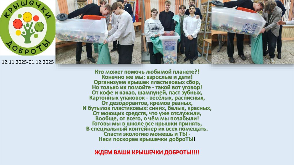 Спасти экологию можешь и ТЫ Неси поскорее крышечки доброТЫ!