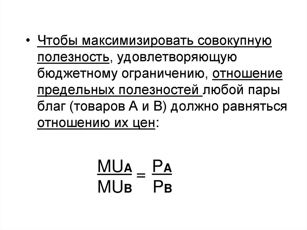 • Точка потребительского равновесия (оптимума) товарный набор, максимизирующий совокупнуюполезность потребителя. Лежит в точке касания