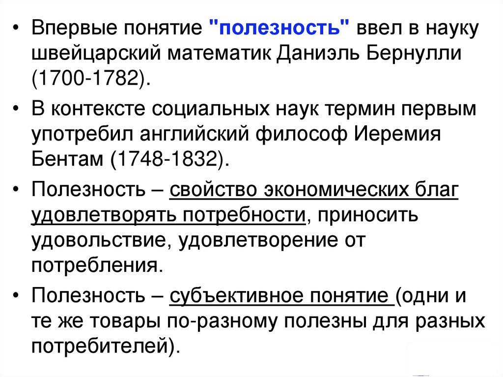 • Впервые понятие "полезность" ввел в наукушвейцарский математик Даниэль Бернулли