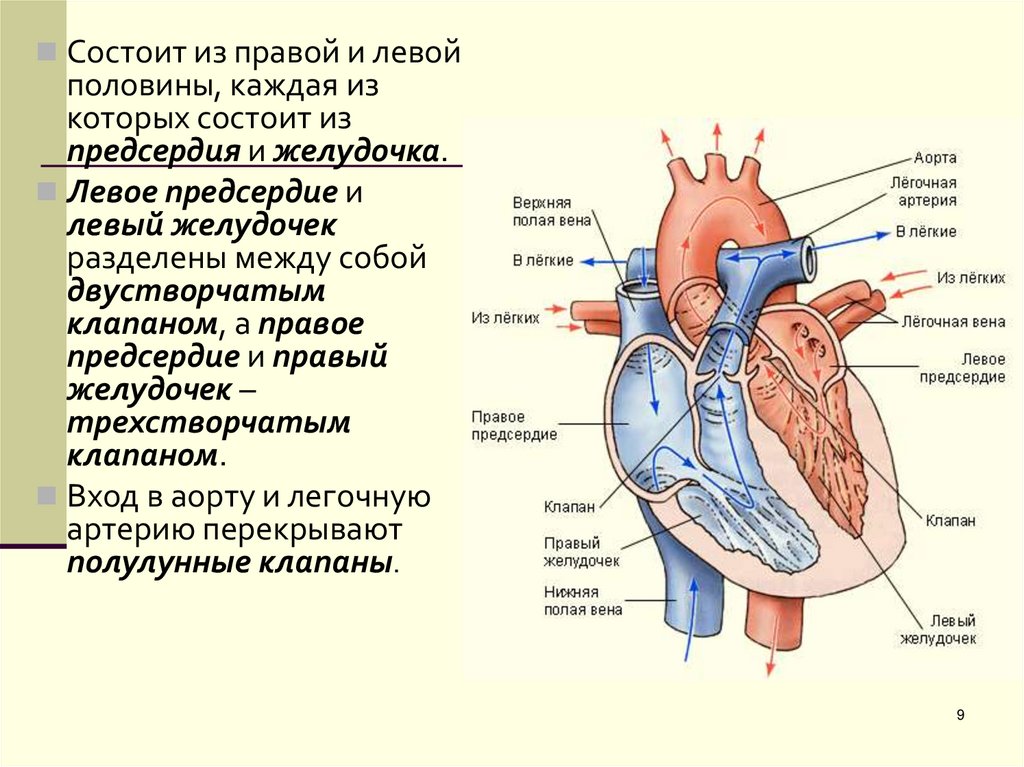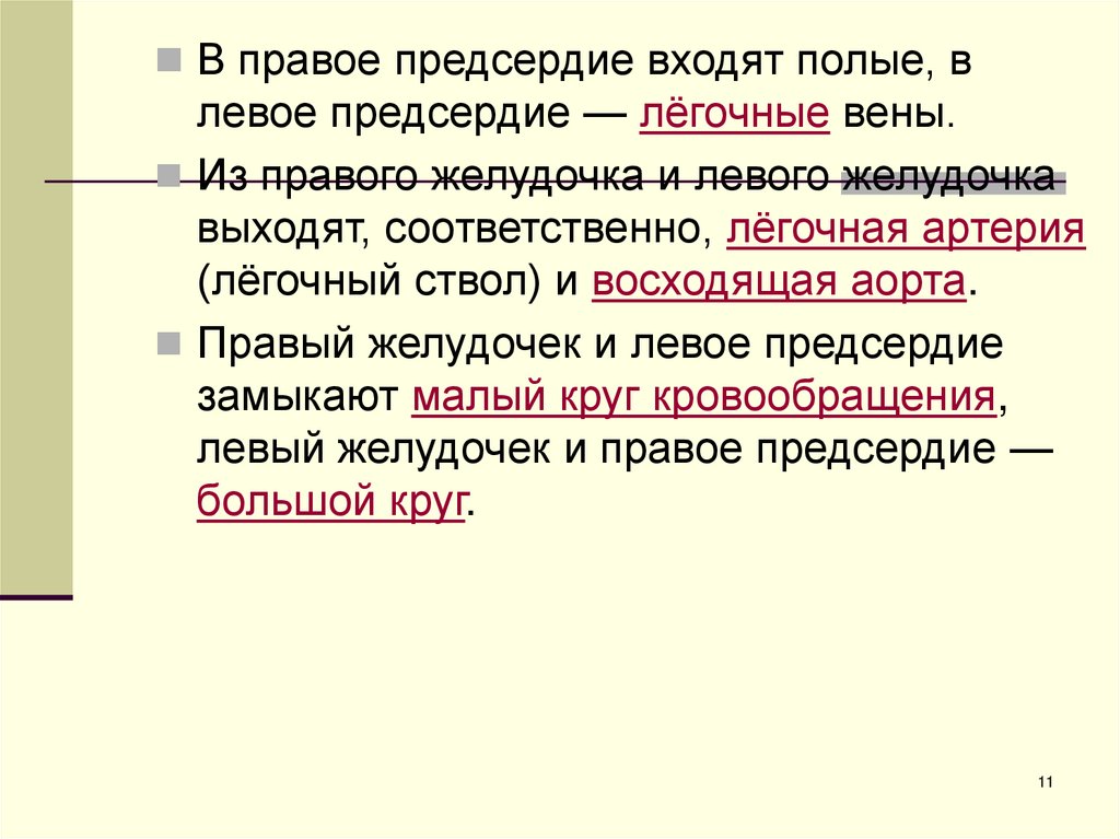 В правое предсердие входят полые, влевое предсердие — лёгочные вены.