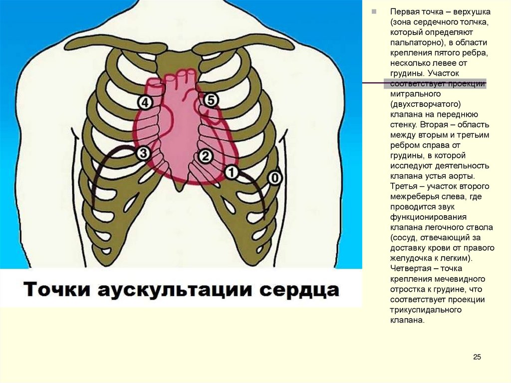 ребер, верхушка сердца определяется слева