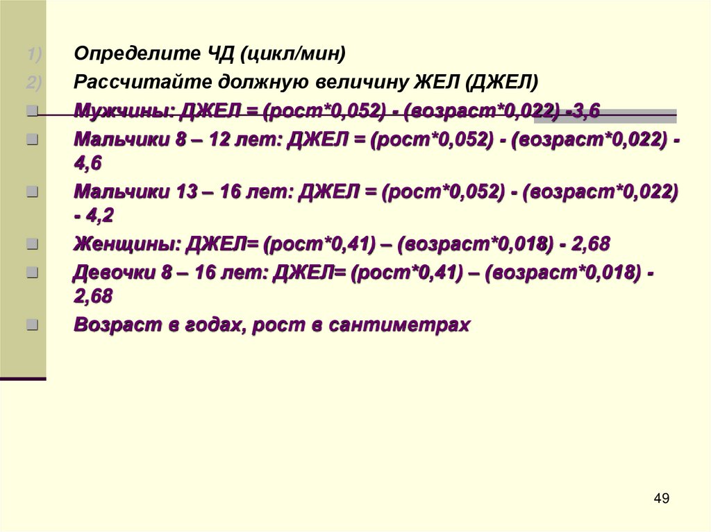 Девочки 8 – 16 лет: ДЖЕЛ= (рост*0,41) – (возраст*0,018) 2,68