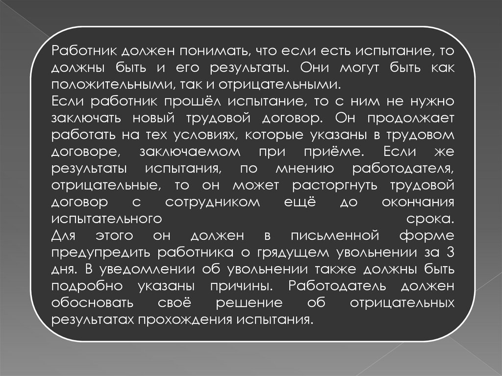 Работник должен понимать, что если есть испытание, тодолжны быть и его результаты. Они могут быть как