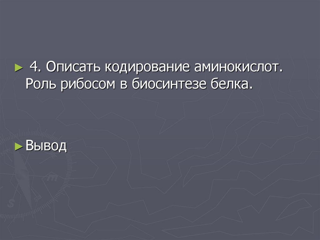► 4. Описать кодирование аминокислот.Роль рибосом в биосинтезе белка.