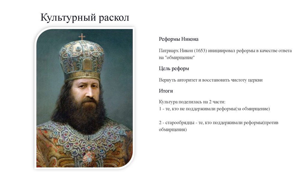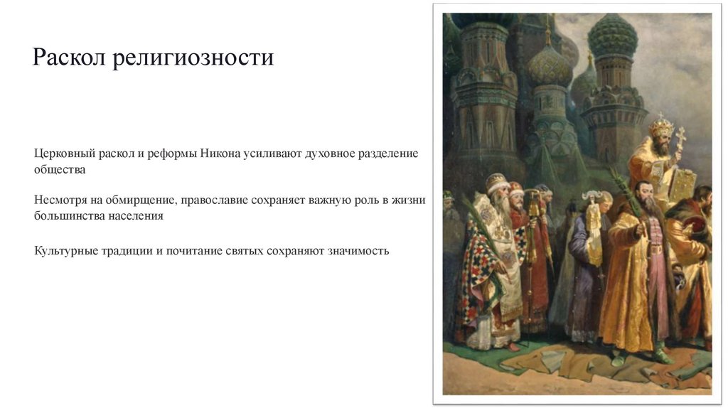 Раскол религиозностиЦерковный раскол и реформы Никона усиливают духовное разделение
