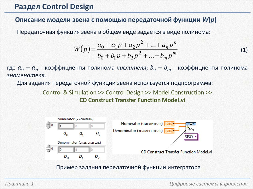 Раздел Control DesignОписание модели звена с помощью передаточной функции W(p)