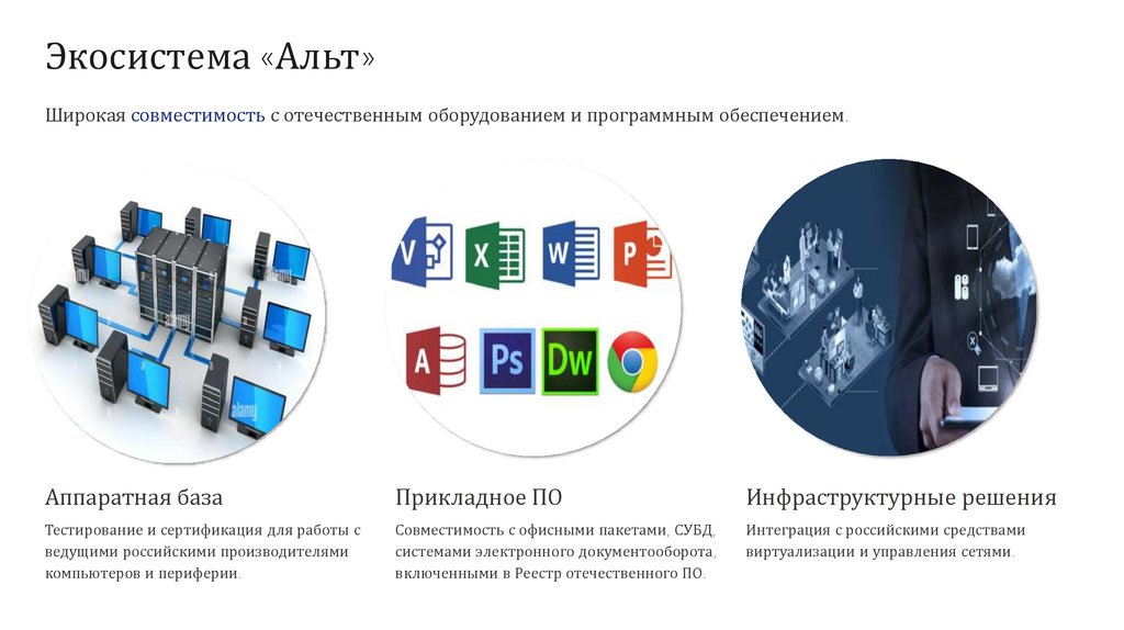 Экосистема «Альт»Широкая совместимость с отечественным оборудованием и программным обеспечением.