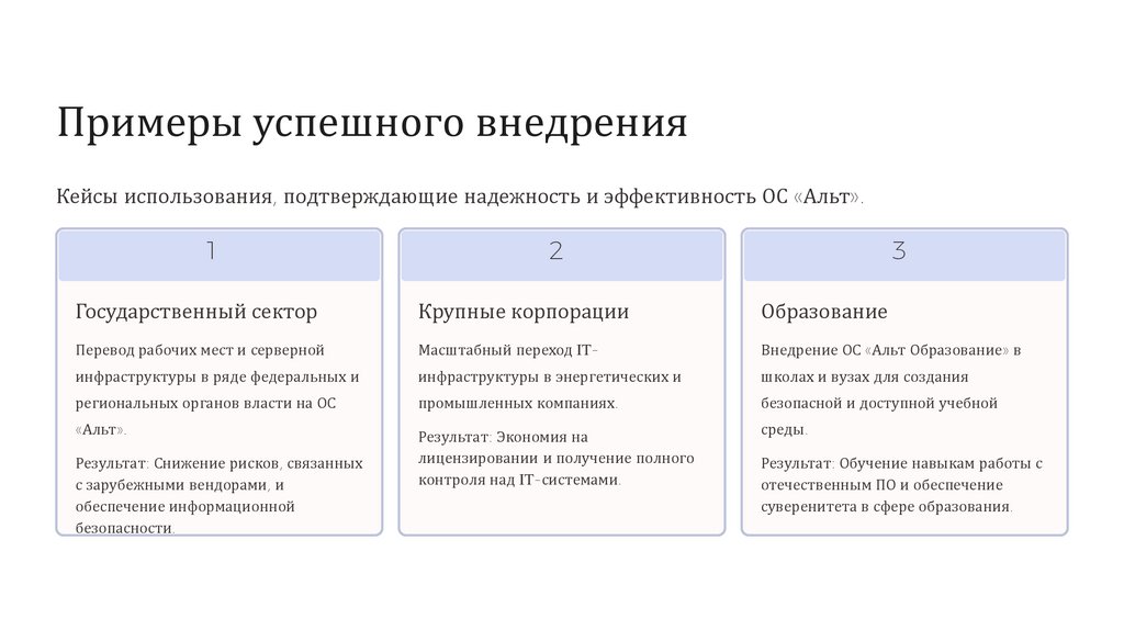 Примеры успешного внедренияКейсы использования, подтверждающие надежность и эффективность ОС «Альт».