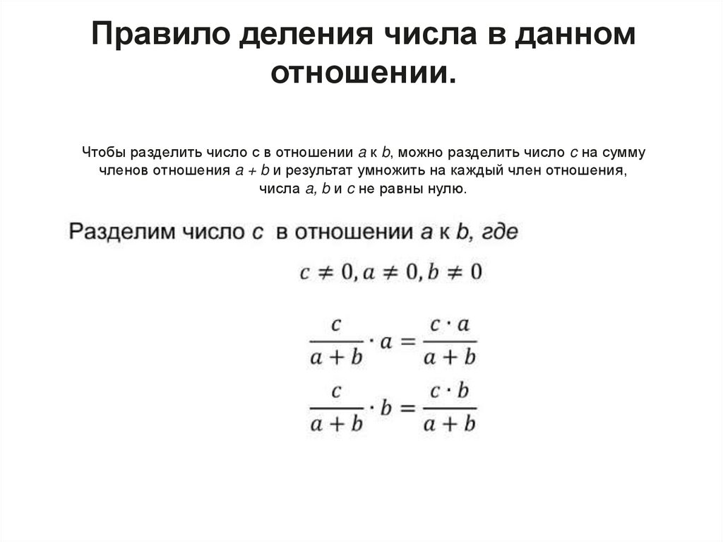 Чтобы разделить число c в отношении a к b, можно разделить число c на сумму