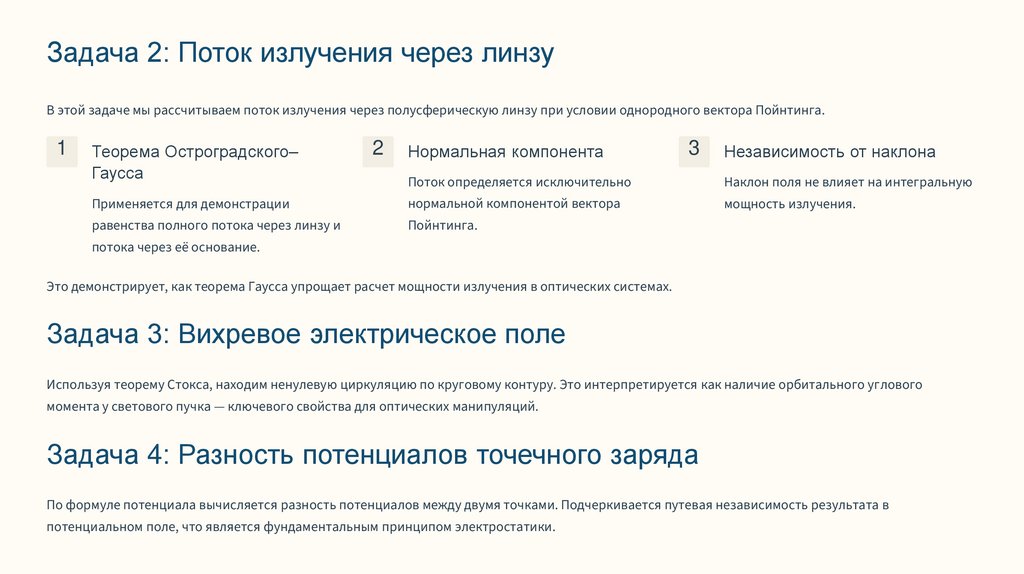распространение света, потоки излучения и электростатические поля, используя математический анализ для получения физически значимых результатов.