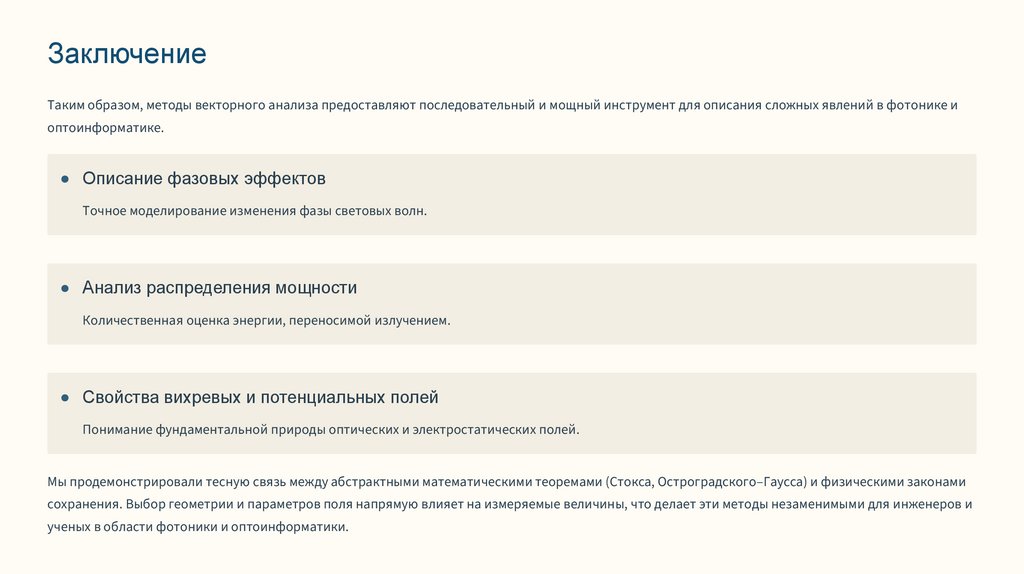 ЗаключениеТаким образом, методы векторного анализа предоставляют последовательный и мощный инструмент для описания сложных явлений в фотонике и