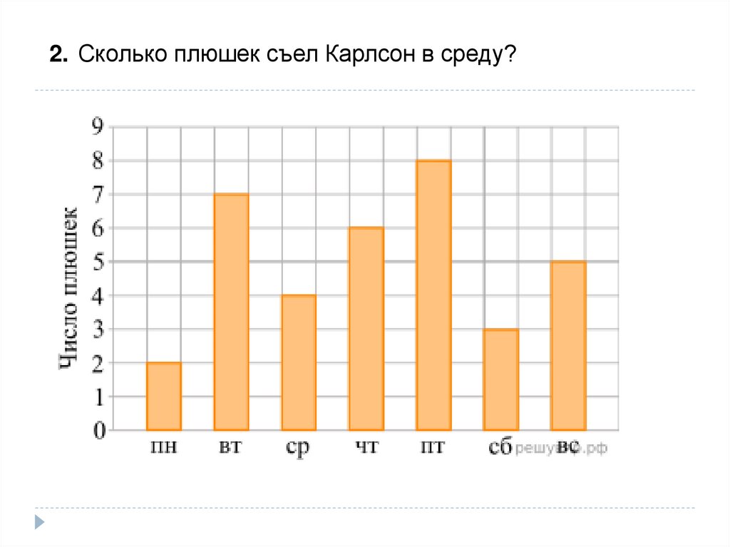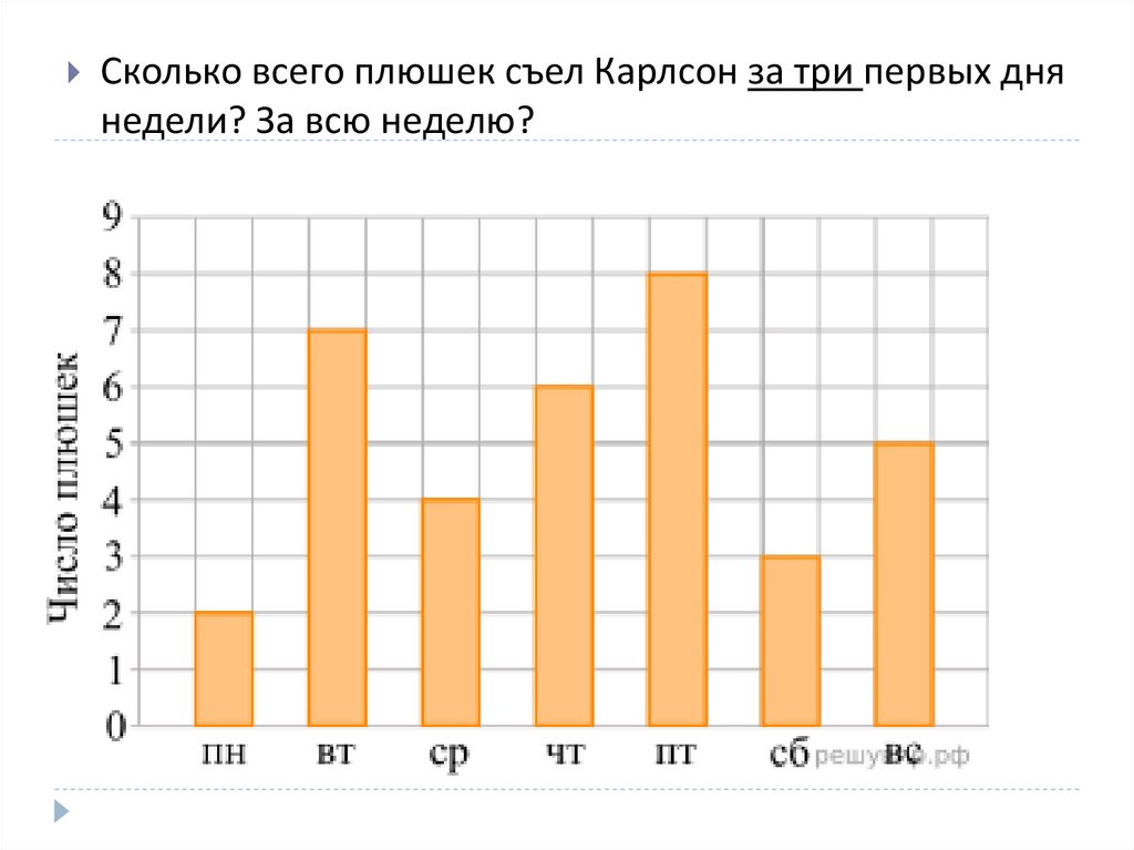 Сколько всего плюшек съел Карлсон за три первых днянедели? За всю неделю?