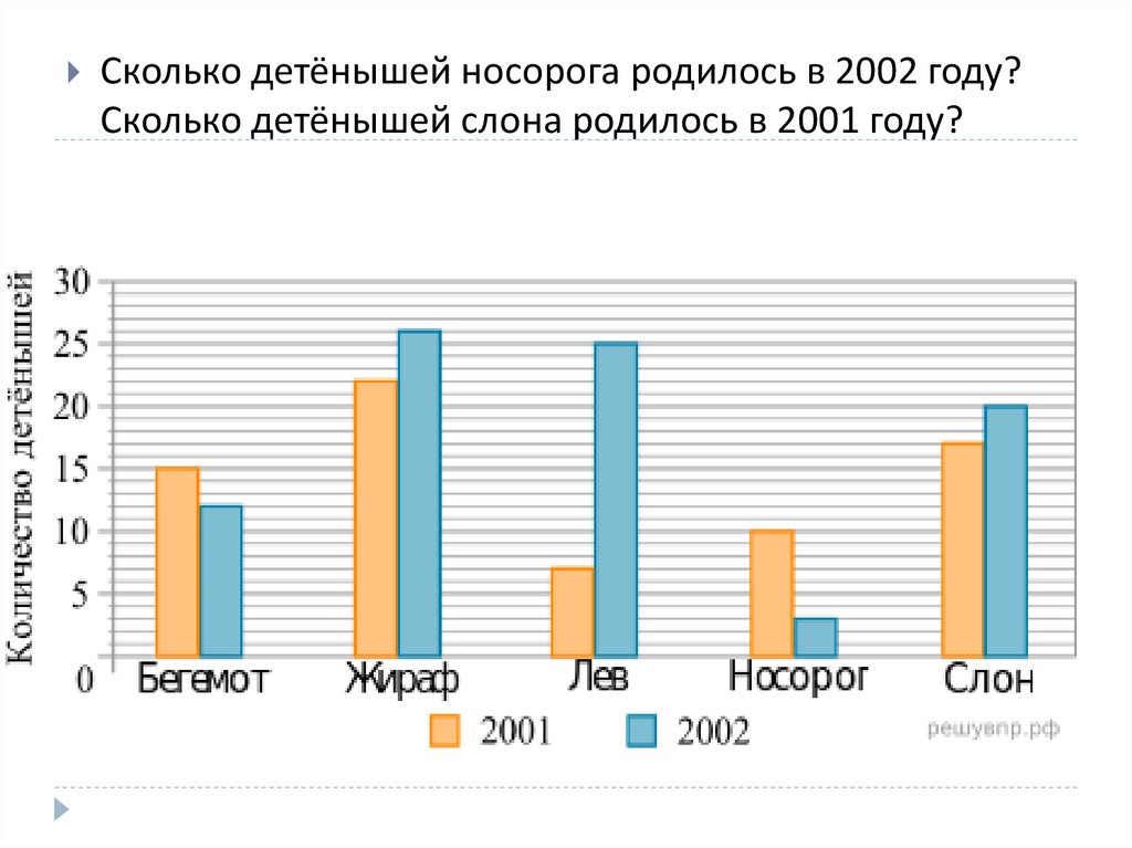 Сколько детёнышей носорога родилось в 2002 году?Сколько детёнышей слона родилось в 2001 году?
