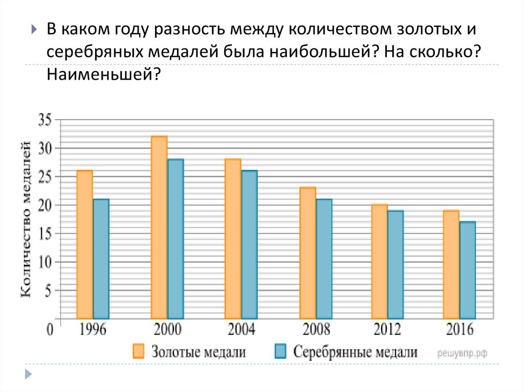 В каком году разность между количеством золотых исеребряных медалей была наибольшей? На сколько?