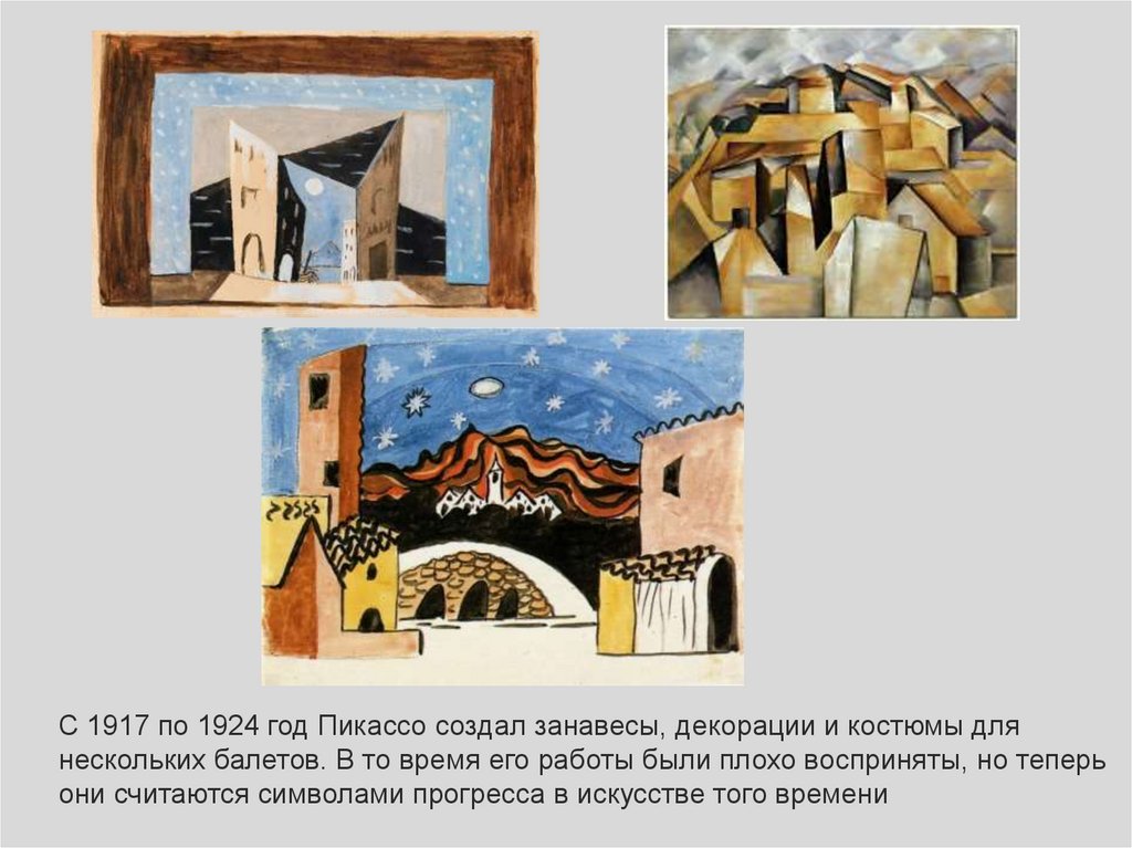 С 1917 по 1924 год Пикассо создал занавесы, декорации и костюмы длянескольких балетов. В то время его работы были плохо восприняты, но теперь