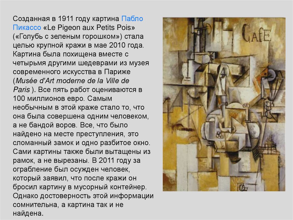 Созданная в 1911 году картина ПаблоПикассо «Le Pigeon aux Petits Pois»