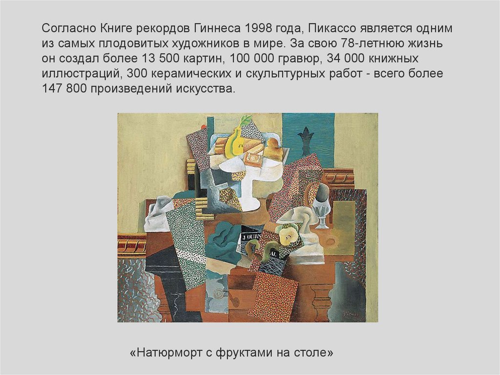 Согласно Книге рекордов Гиннеса 1998 года, Пикассо является однимиз самых плодовитых художников в мире. За свою 78-летнюю жизнь