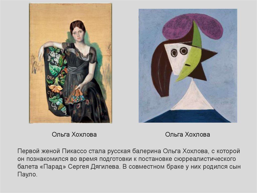 Первой женой Пикассо стала русская балерина Ольга Хохлова, с которой