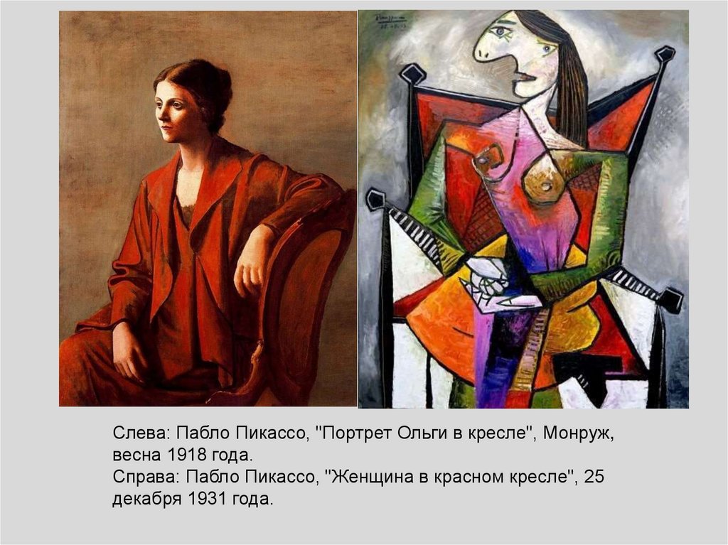 Слева: Пабло Пикассо, "Портрет Ольги в кресле", Монруж,весна 1918 года.